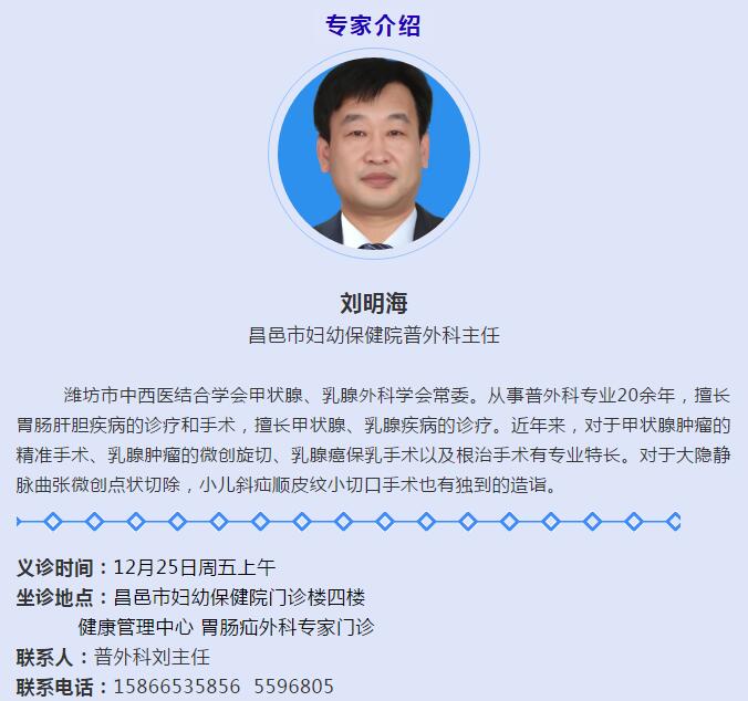 为给更多疝病患者带来更加专业、精准的诊疗,让更多疝病患者与疝外科专家进行面对面的咨询并切实解决疝病患者的各种问题,昌邑市妇幼保健院将于12月25日(星期五)上午,举行疝与腹壁外科疾病义诊活动,届时将由潍坊医学院附属医院疝与腹壁外科及胃肠肛门疾病外科专家与昌邑市妇幼保健院普外科专家为各类疝病患者提供全面、专业、权威的咨询,进行免费义诊,预约手术!