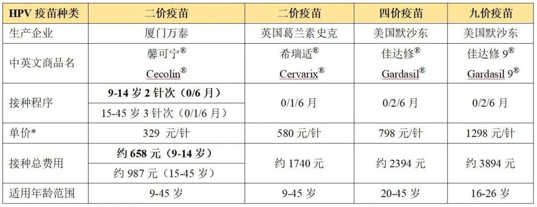 此外,不同宫颈癌疫苗的适宜接种人群也有所不同,二、四、九价疫苗适宜接种人群分别为9-45岁、20-45岁、16-26岁。