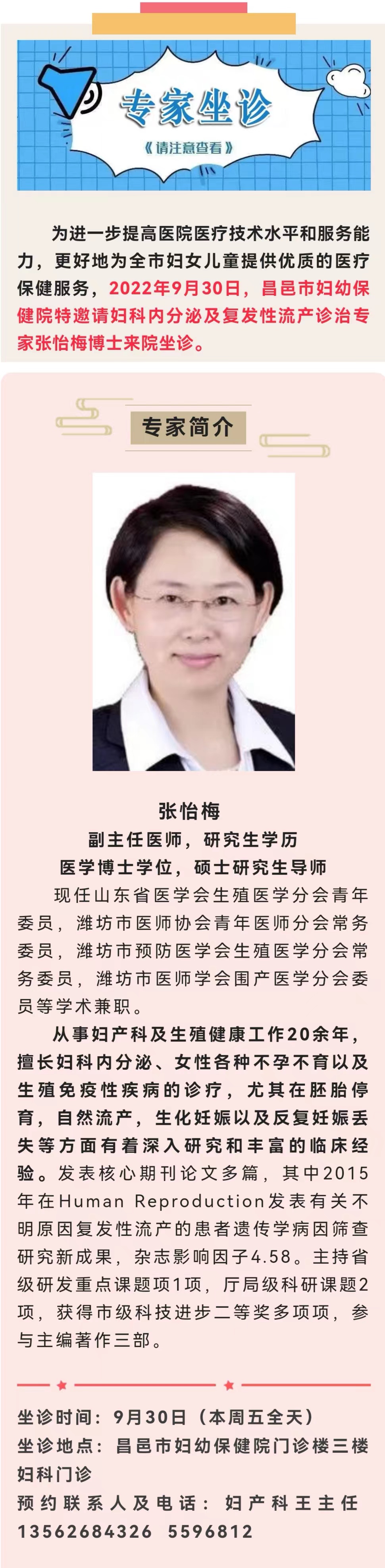 【专家坐诊】9月30日(本周五)妇科内分泌专家张怡梅博士来昌邑妇幼坐诊