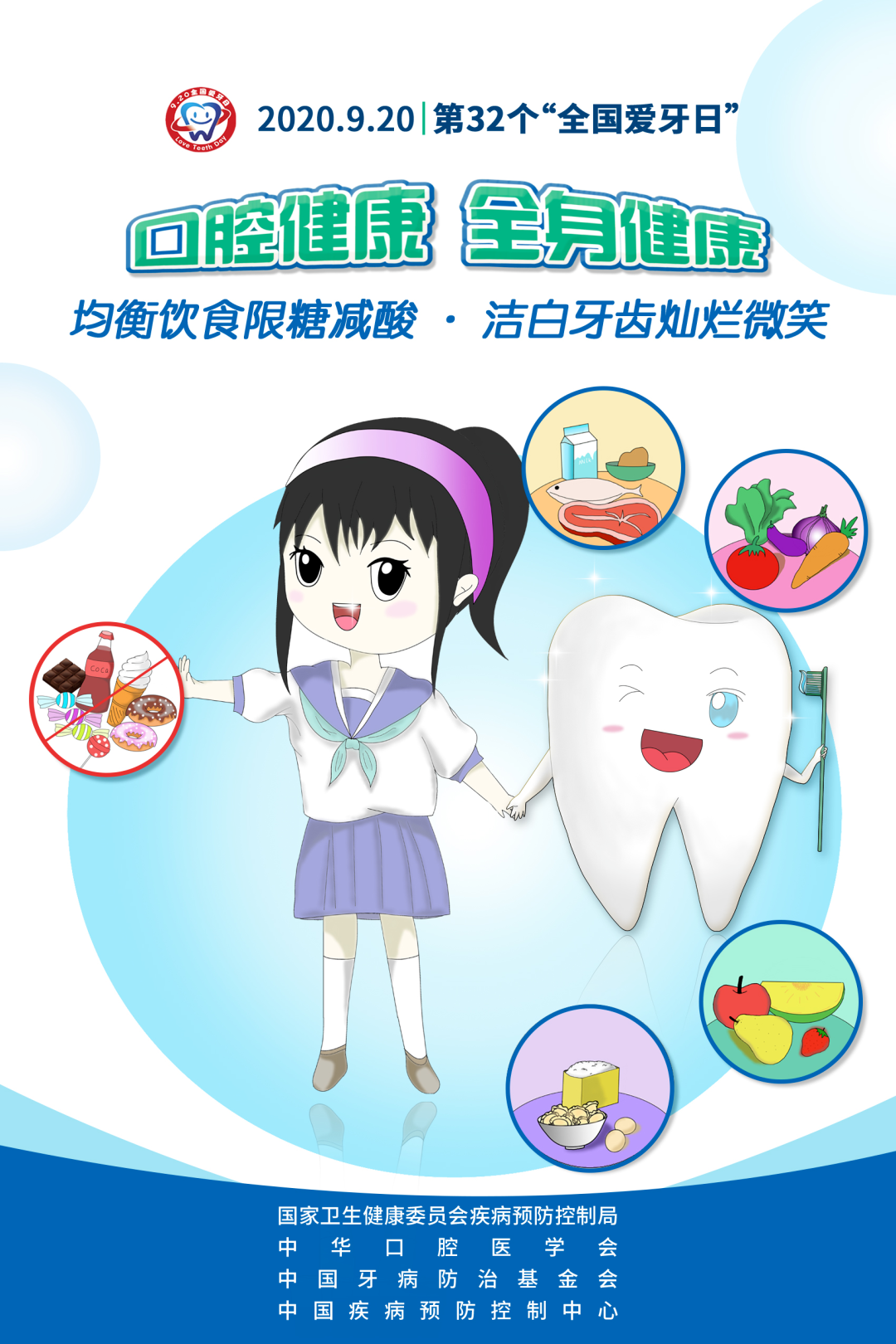 2020年9月20日是第32个“全国爱牙日”,今年的宣传主题是“口腔健康?全身健康”,副主题是“均衡饮食限糖减酸?洁白牙齿灿烂微笑”。