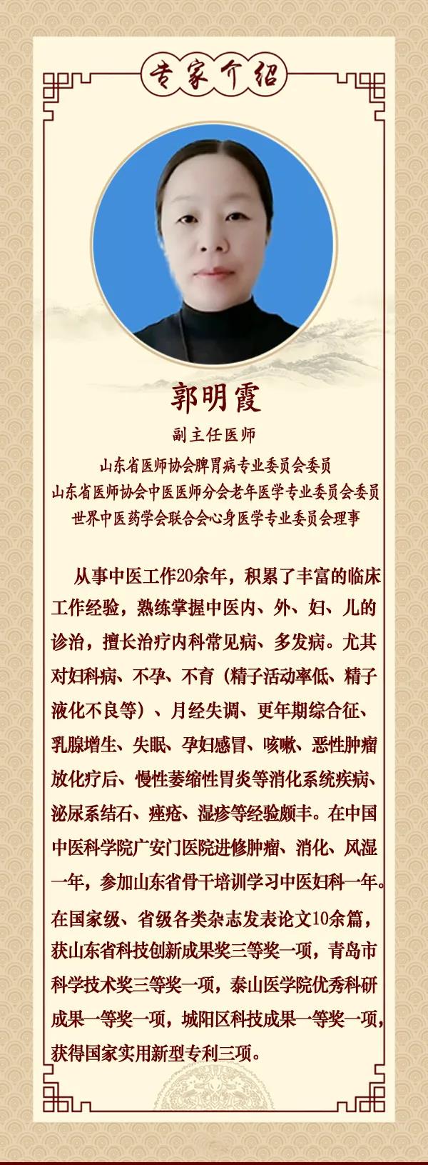 为了让更多的百姓受惠于中医,让昌邑百姓在家门口就可享受到国内顶尖名医的诊疗服务,昌邑市妇幼保健院特邀中医妇科专家、世界中医药学会联合会心身医学专业委员会理事郭明霞9月26日(星期六)来院坐诊。