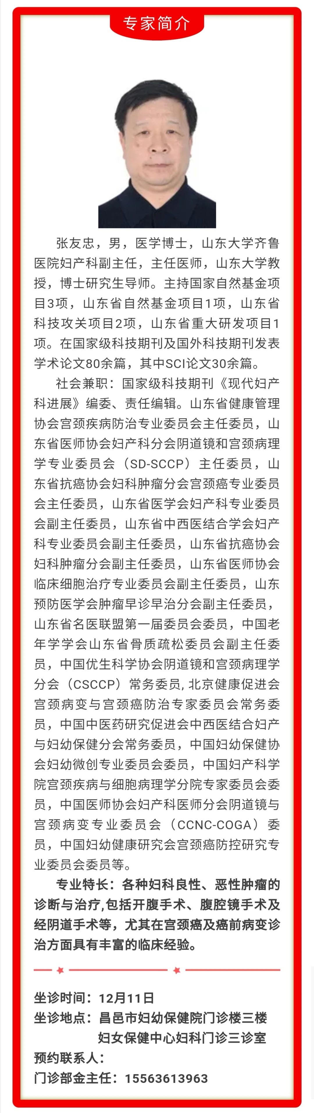 为了让更多的百姓受惠,让昌邑百姓在家门口就可享受到国内顶尖名医的诊疗服务,昌邑市妇幼保健院特邀山东大学齐鲁医院妇产科副主任、主任医师张友忠教授12月11日(星期五)来院坐诊。预约仅限30人,免挂号费、白带检测费。