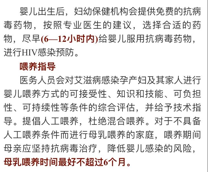对于感染了HIV的孕妇,相关医疗机构会提供免费的抗病毒药物。按照专业医生提供的建议,选择合适的用药方案,及时进行抗病毒治疗。同时,相关医疗机构还会提供安全性行为指导、感染症状和体征监测、营养支持、心理支持、性伴告知与检测等服务。孕产妇一旦发现HIV感染,听从医嘱、及早用药、按时服药,是预防母婴传播传播能否成功的关键。