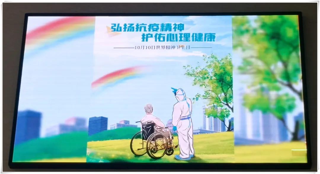 在医院门诊,通过电子屏幕滚动播放宣传日主题,候诊区志愿者发放心理健康及精神卫生知识宣传彩页,世界精神卫生日当天心理门诊开展免费心理健康测评,对门诊孕妇免心理咨询费和心理治疗费,对职工开展心理健康评估,心理健康讲座,促进职工身心健康。