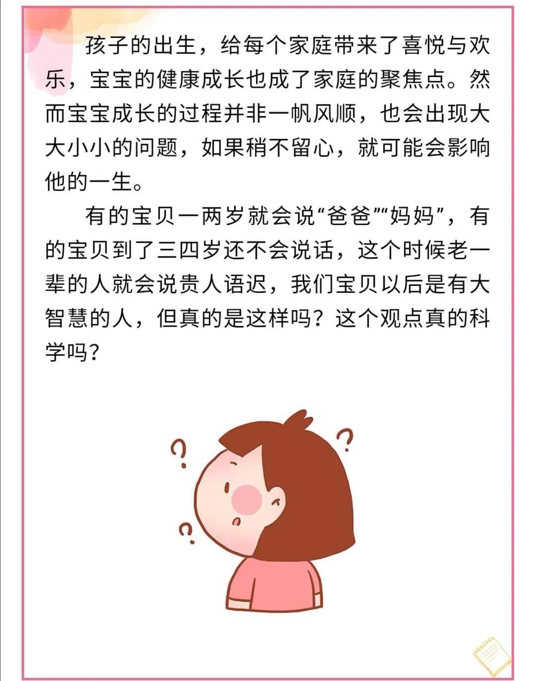 “贵人语迟”最早出自《论语》,原句为“贵人语迟,敏于行却不讷于言,泰山崩于前而色不变,麋鹿兴于左而目不瞬”。所以由此,可以分析出其原意是有内涵有思想的人,是不会多话,也不会抢话。然而这个词到了现代,就常被人们误读为开口说话晚的人是“贵人”,所以“说话晚的孩子聪明、有大智慧”这种说法也就毫无科学依据。