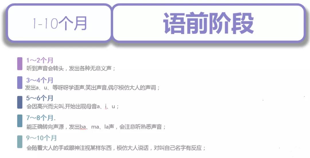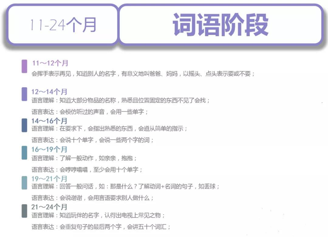 各位宝爸宝妈们,可以通过下面这张表格进行对照,看看宝贝是否有语言发育迟缓的现象吧!